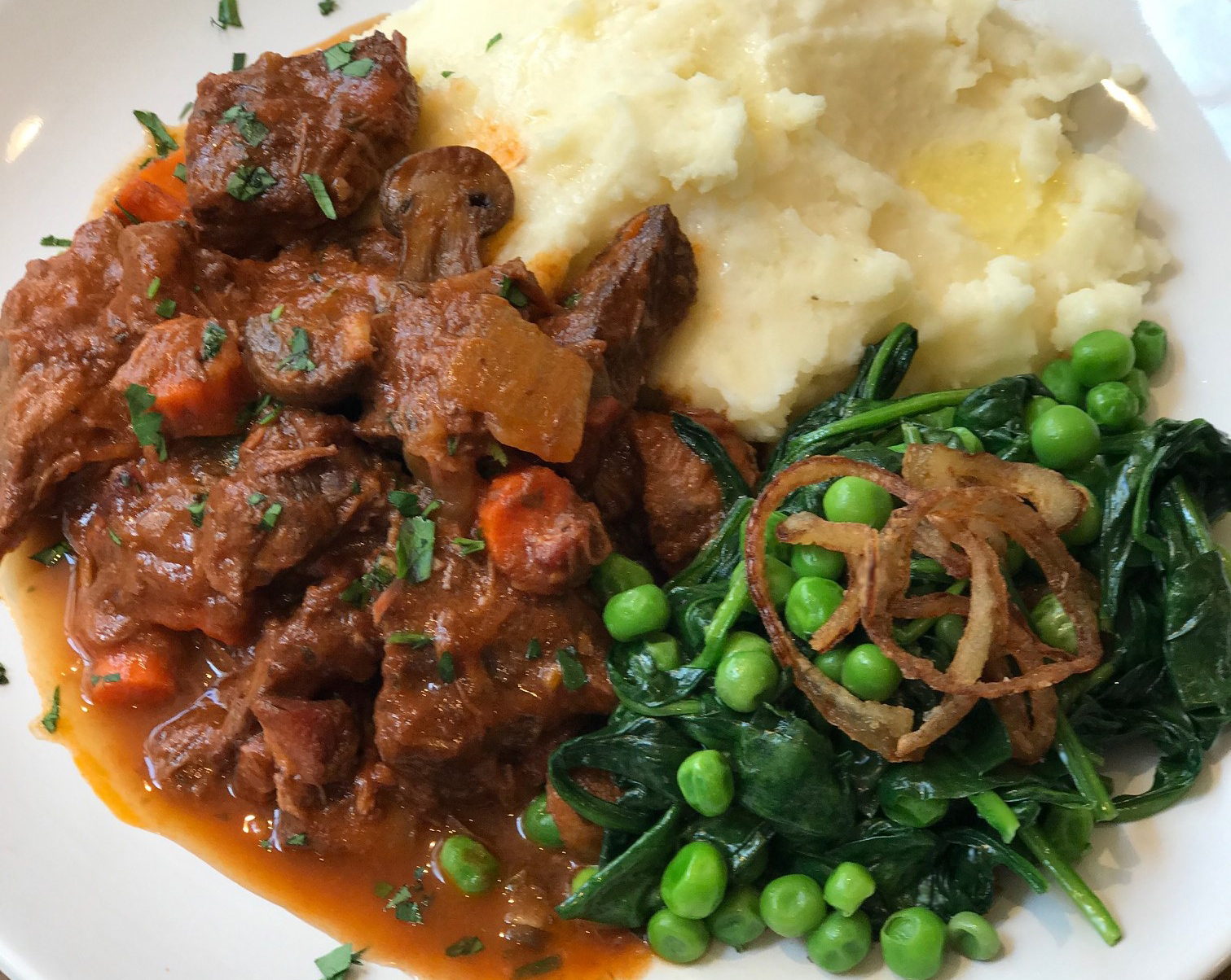 Beef Bourguignon Crème fraîche mashed potatoes and peas & baby spinach with crispy shallots. Available HOT starting at 4:00pm.