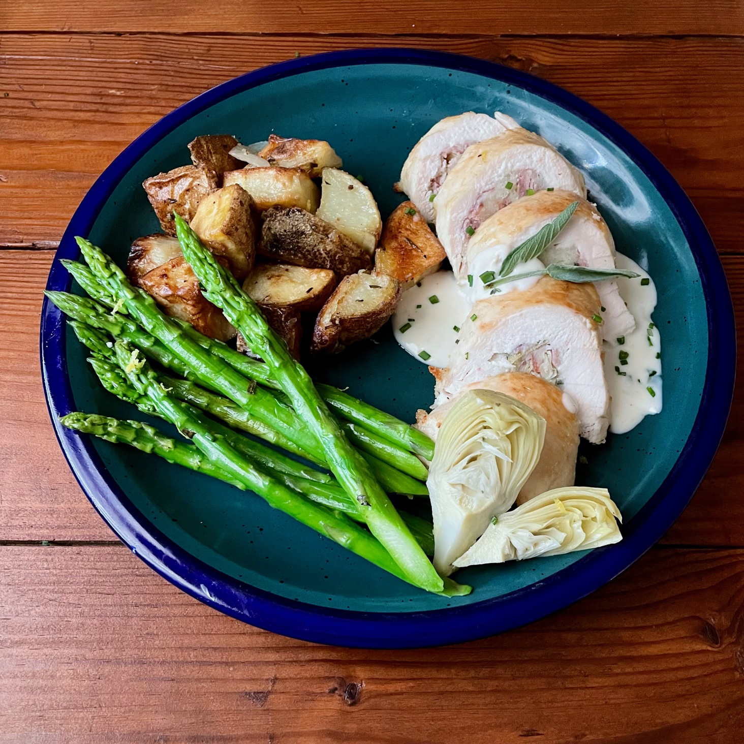 Ham & Artichoke Stuffed Chicken Breast roasted rosemary potatoes and lemon asparagus. Available HOT at 4:00 pm, and COLD To Go daily through Sunday, August 6th.