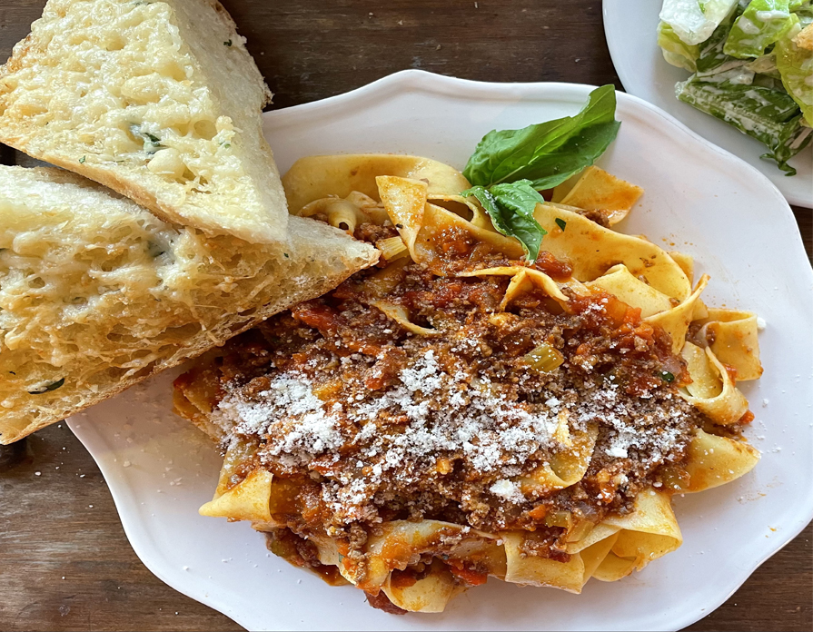 Pasta Bolognese Our slow simmered red sauce & mozzarella, romaine & radicchio salad with Italian dressing and francese garlic bread. Available HOT starting at 4:00 pm.